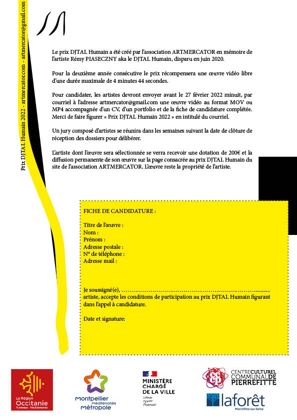 Pour candidater, les artistes devront envoyer avant le 27 février 2022 minuit, par courriel à l’adresse artmercator@gmail.com une œuvre vidéo au format MOV ou MP4 accompagnée d’un CV, d’un portfolio et de la fiche de candidature complétée. Merci de faire figurer « Prix DJTAL Humain 2022 » en intitulé du courriel.