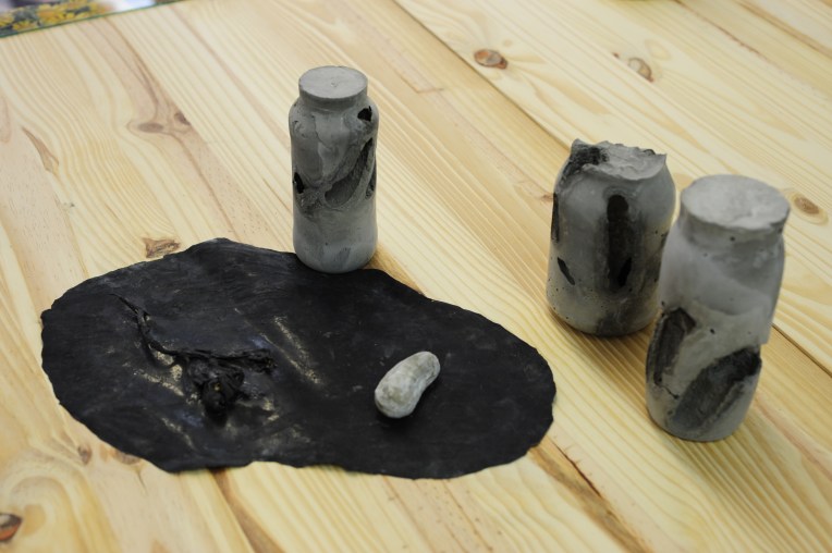 C’est ainsi que le pot en verre finit par contenir une multiplicité d’histoires. Celui-ci, avec le temps, se remplit à ras bord laissant voir, en transparence, pêle-mêle, les jambes d’une figurine, un porte-clé en forme de coeur, une bille ou un bracelet contre le mauvais oeil.