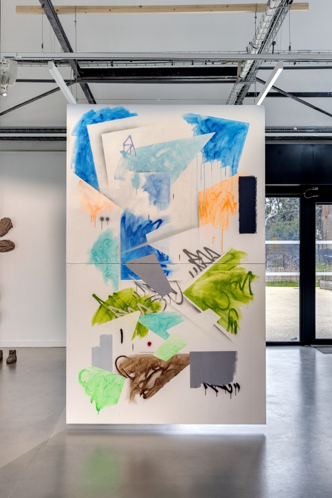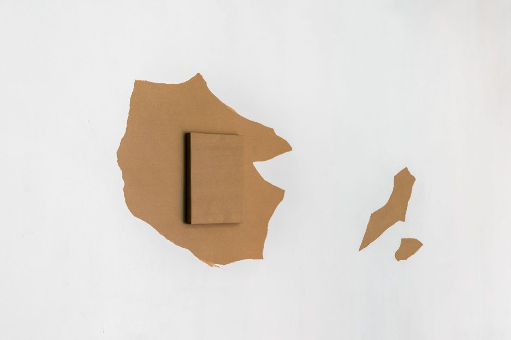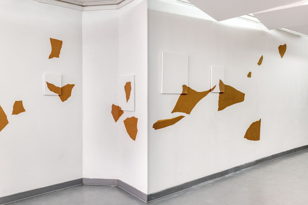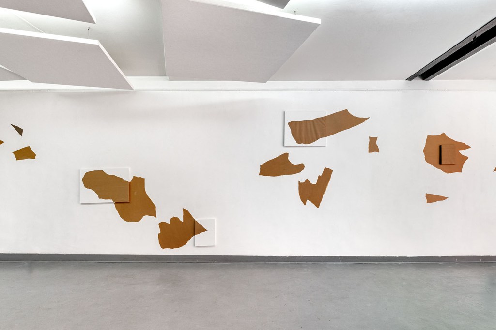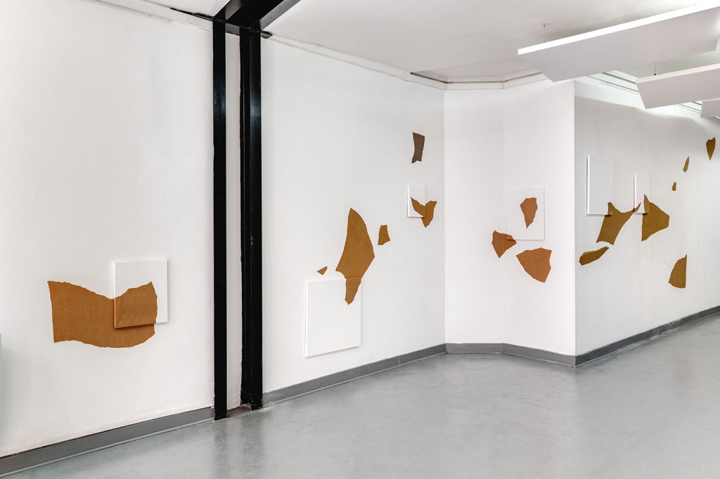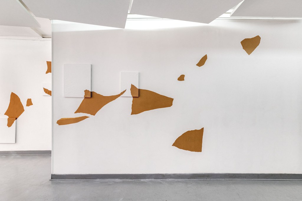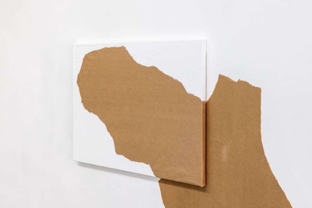 Le kraft, rarement présenté artistiquement en l’état et habituellement relégué au support de croquis préparatoire, devient ici le principal sujet de monstration. Philippe Marcus l’entoile à des châssis de tableaux, anoblissant ce matériau versatile et modulable, souvent invisibilisé, en le replaçant dans l’histoire de l’art. Partiellement recouverts de peinture industrielle, ces simulacres de toiles à l’aspect inachevé nous interrogent sur la distinction entre l’œuvre et l’ouvrage, mais surtout sur la notion de non-finito. Où commence et s’arrête le travail de l’artiste ? Quels en sont, finalement, les contours et les limites ?