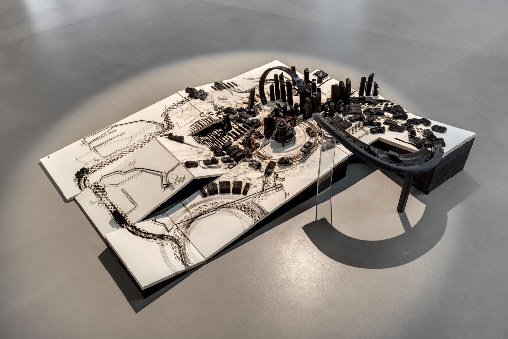 L’espace d’exposition est donc pensé ouvert et dépourvu de cimaises. Il s’agit de copier un instant précis du terrain vague. Par ce choix curatorial se dessine alors la volonté claire de ne pas modifier le sens du lieu par des artifices muséaux et d’utiliser la « bricologie » comme solution d’accrochage pour l’ériger au rang d’archétype de présentation. Ainsi,