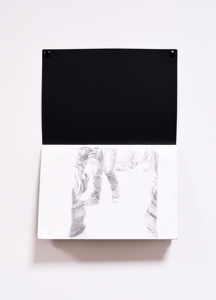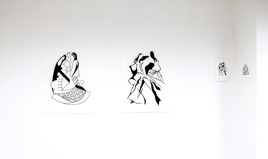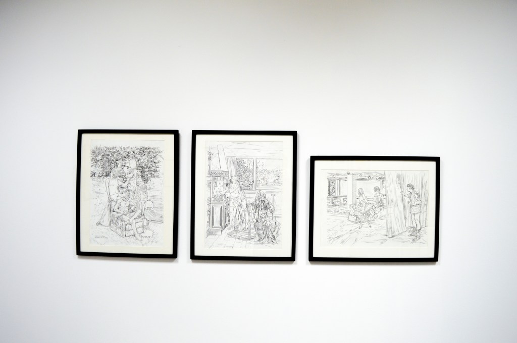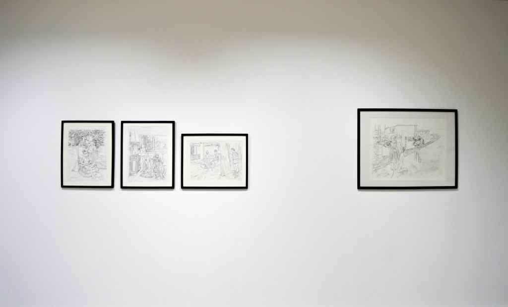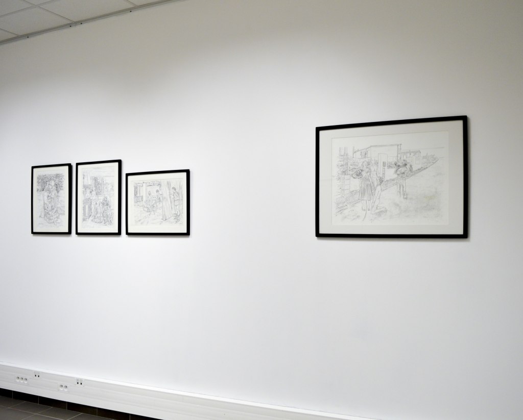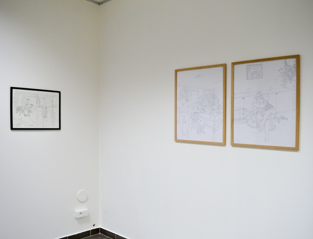 Les compositions de David PERCHEY, bien qu’habitées de quelques figures, n’en sont pas moins désolées. Désorientés, on s’arrête, surpris alors, par ce dessin fantôme dans lequel les narrations se chevauchent, pour mieux brouiller les pistes. Le dessin évoque le calque et les images se superposent, comme pour mettre à nu les différentes couches du temps. Une sorte de flou plane alors sur ces mises en scène, peuplées de réminiscences qui se manifestent en une multitude de traits. C’est d’ailleurs à des endroits bien précis de la composition qu’ils s’accumulent en une vibration incontrôlée, figeant les mouvements. On se retrouve, pris au piège dans la psychose des personnages, si ce n’est pas notre propre hallucination, hantée par ses figurants. Évidement les thématiques ont quelque chose de dérangeantes, et s’inscrivent à l’encontre des convenances, loin de ce puritanisme pernicieux qui fait le quotidien de notre belle-mère*.