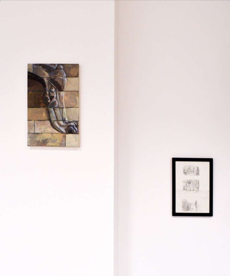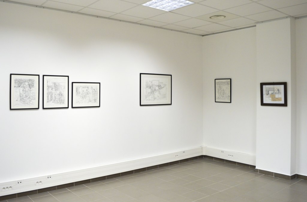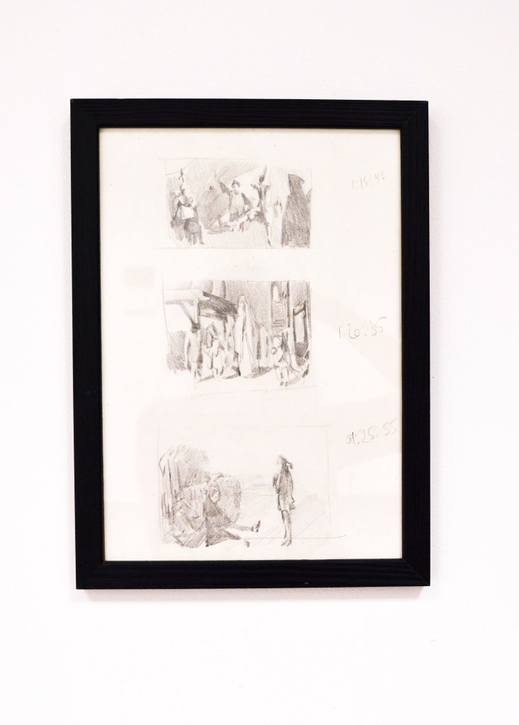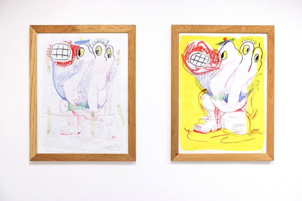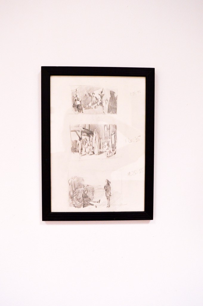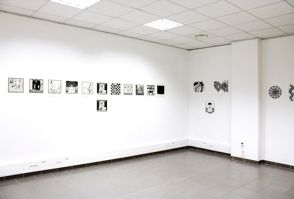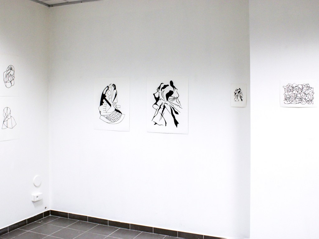 Les compositions de David PERCHEY, bien qu’habitées de quelques figures, n’en sont pas moins désolées. Désorientés, on s’arrête, surpris alors, par ce dessin fantôme dans lequel les narrations se chevauchent, pour mieux brouiller les pistes. Le dessin évoque le calque et les images se superposent, comme pour mettre à nu les différentes couches du temps. Une sorte de flou plane alors sur ces mises en scène, peuplées de réminiscences qui se manifestent en une multitude de traits. C’est d’ailleurs à des endroits bien précis de la composition qu’ils s’accumulent en une vibration incontrôlée, figeant les mouvements. On se retrouve, pris au piège dans la psychose des personnages, si ce n’est pas notre propre hallucination, hantée par ses figurants. Évidement les thématiques ont quelque chose de dérangeantes, et s’inscrivent à l’encontre des convenances, loin de ce puritanisme pernicieux qui fait le quotidien de notre belle-mère*.