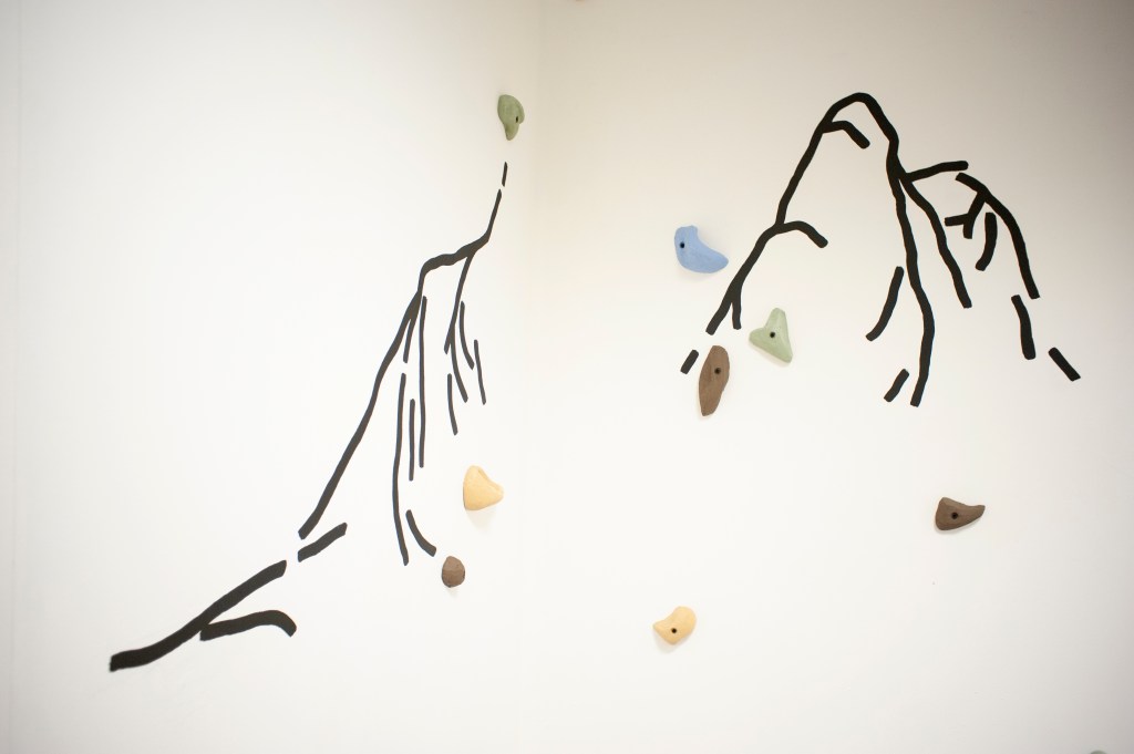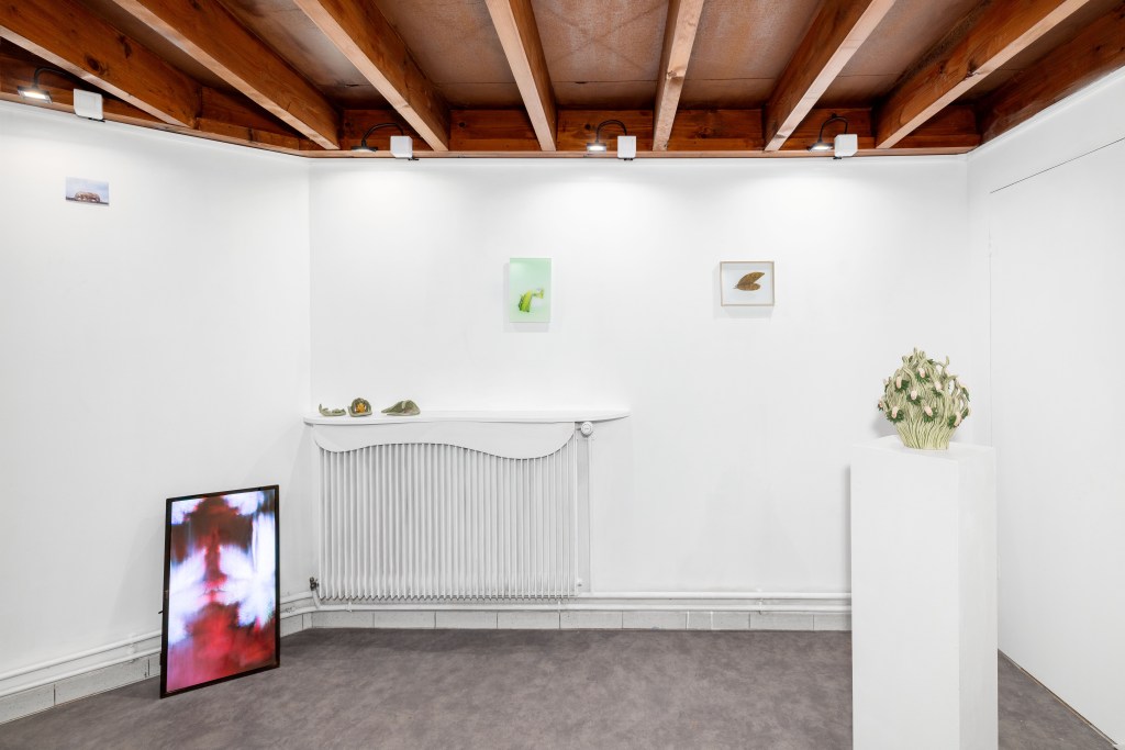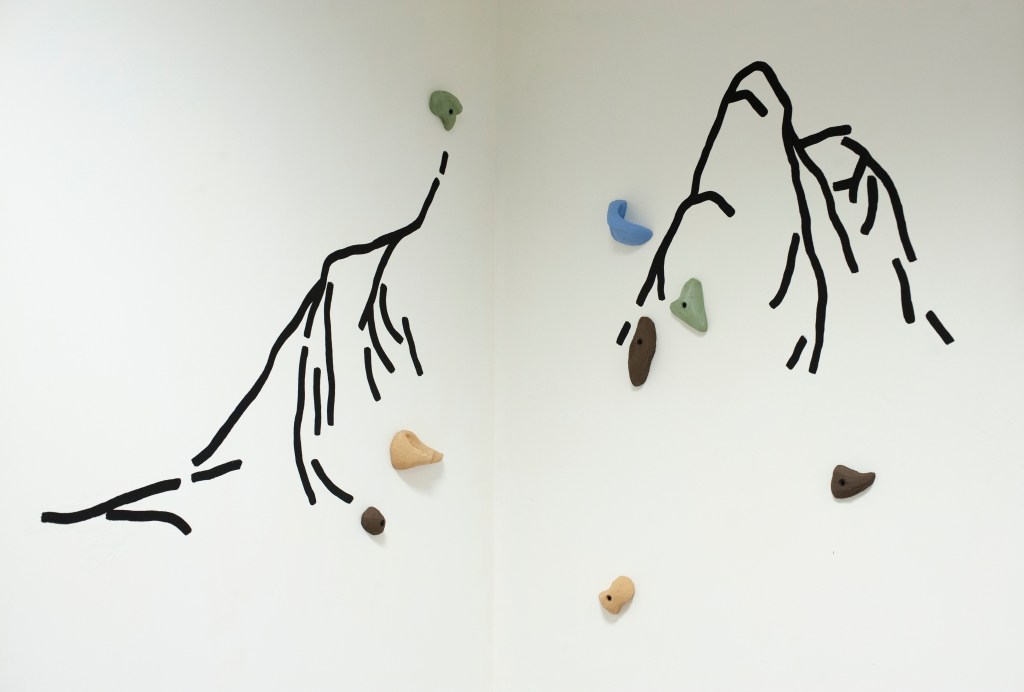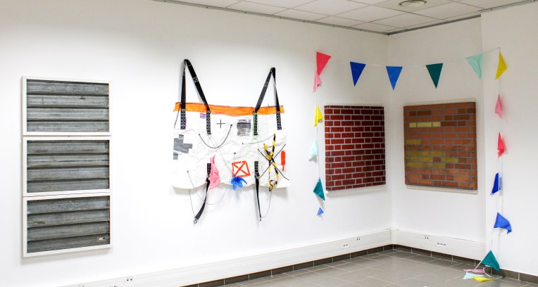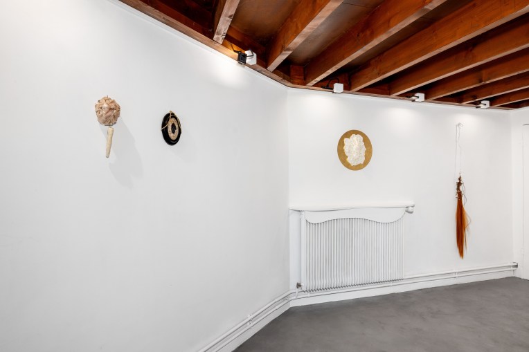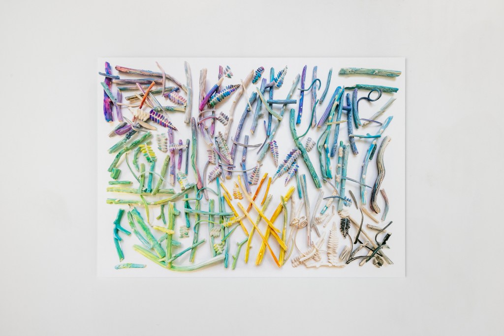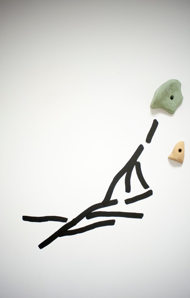 Abordé initialement par son titre joyeusement caustique, l’exposition Ménage à trois dépeint la galerie Jacques BIVOUAC, la faisant théâtre d’un équivoque arrangement domestique. C’est ici que font ménage les œuvres des trois artistes, Hélène Bleys, Jeannie Brie et Julie Freichel. C’est dans cette antichambre qu’elle ont imaginée une cohérence de proposition, usant d’un jeu de questions/ réponses, une œuvre renvoyant à l’autre et inversement. Se ressent dans la proposition une métonymie de la forêt. Des collections de bâtons à l’image, de la jolie feuille ramassée lors d’une promenade jusqu’à la représentation d’une forêt dense abattue. De l’arbre au papier, de la feuille à la branche. Les références, diverses s’entremêlent et se font écho. Se faisant figure partielle d’un tout, pièce d’un savant assemblage dont les morceaux n’évoquent pas tant des solutions que des possibilités.