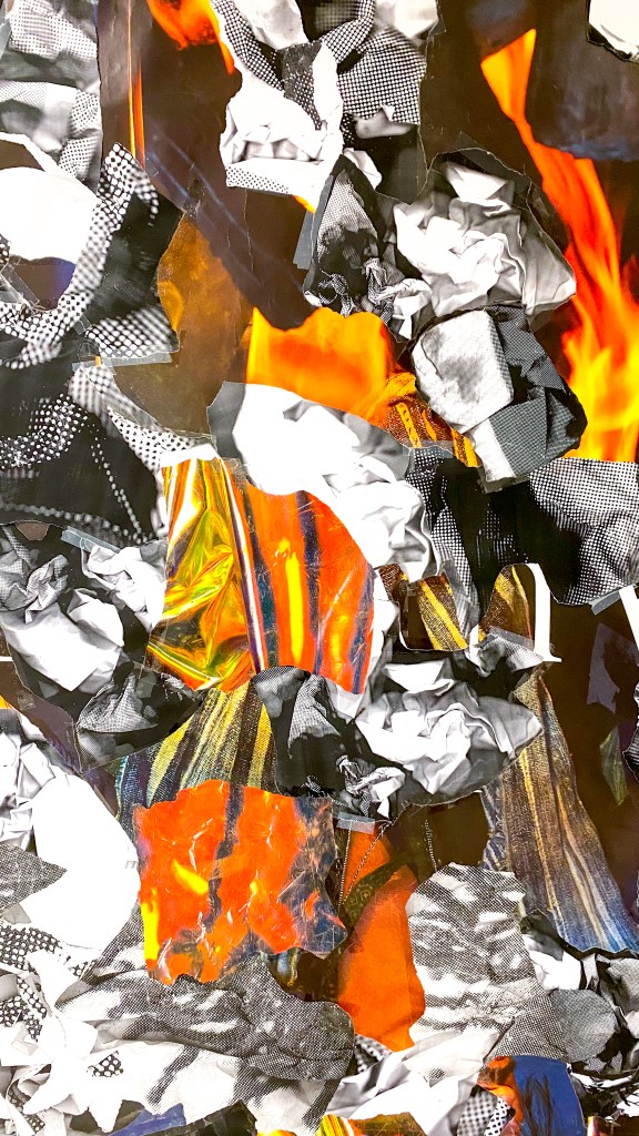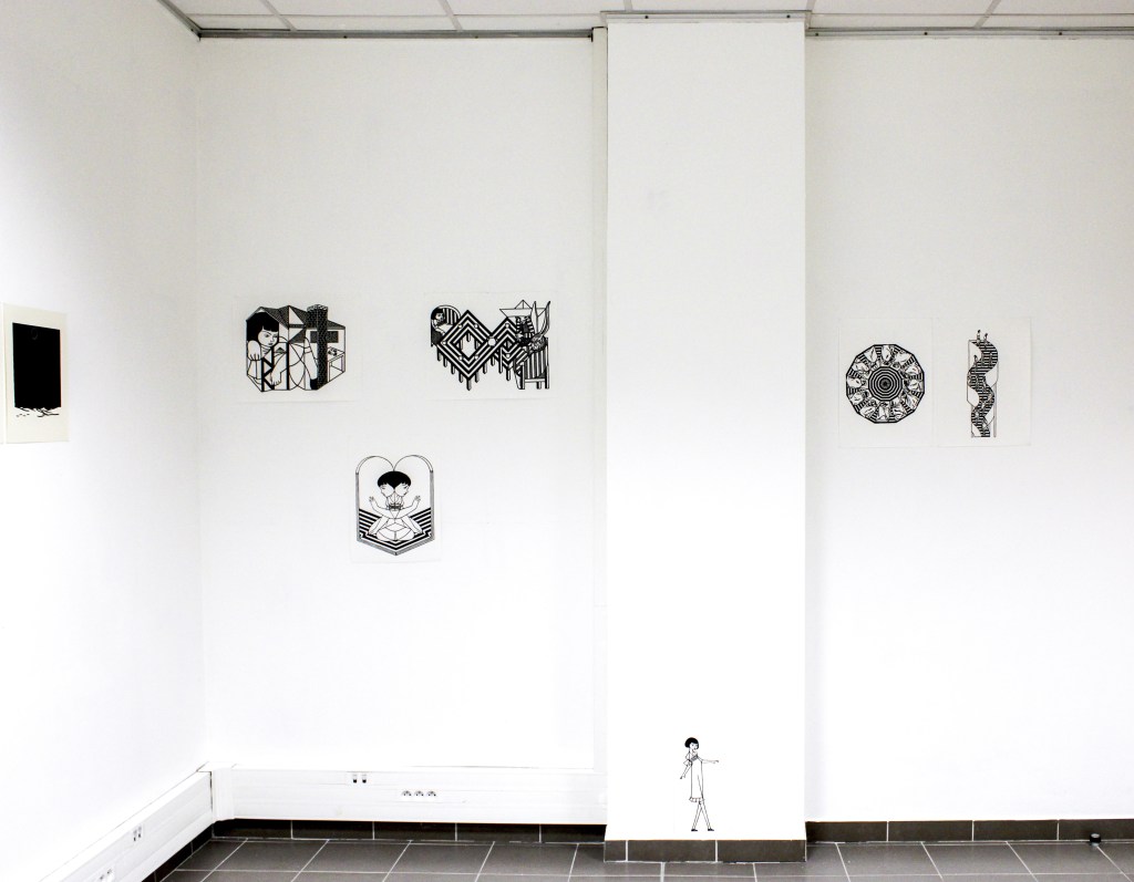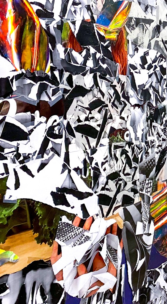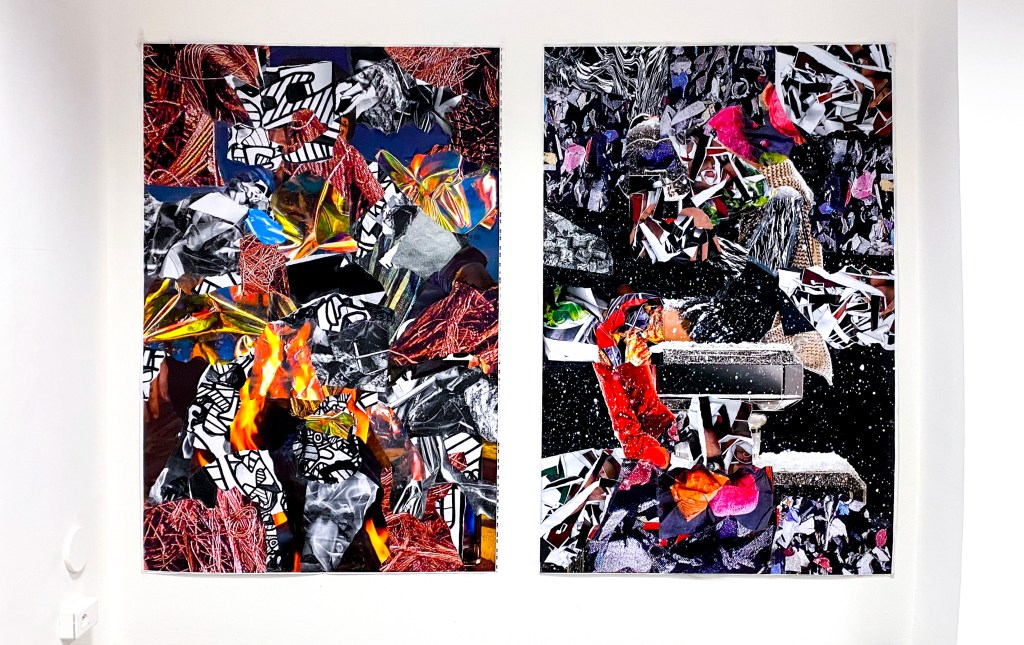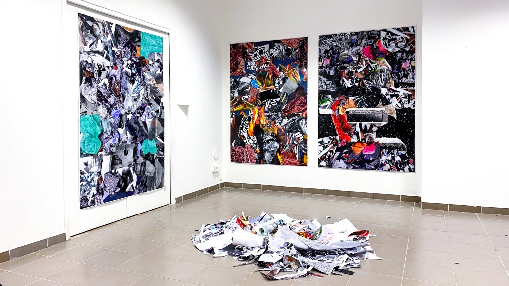Julia KREMER nous livre une œuvre flottante, à la fois mouvement et plénitude. Elle nous propose des panoramas cousus de pièces éparses. Comme une nébuleuse qui s’étendrait à l’infini. Ainsi, l’espace de l’œuvre, n’est jamais clos et invite à la continuité. Ce qui n’est pas présenté a autant sa place que ce qui est figuré. Une recomposition savante du monde s’opère à travers un amoncellement de bribes pour créer un témoignage vivace de notre environnement morcelé et disparate. Il y a la multiplicité, au sens de la copie, qui procède d’une transfiguration des éléments de langage, en un flot, telles des vagues isolés qui s’entrecroisent. Quelque chose d’invasif se joue là, à la manière de territoires en lutte. On pourrait, en regardant le travail de Julia, penser à un paysage dévasté, jonché de gravats. L’unité formelle suggérée par l’utilisation du noir et blanc caractéristique de la photocopie est ponctuée, parfois, de quelques rares traits de couleur qui agissent en vibrations ténues mais puissantes. Elles ouvrent une fenêtre de mémoire colorée, au milieu de la bichromie du souvenir. Alors, pour faire fi du chaos ambiant, Il ne nous reste plus qu’à diriger notre regard vers ces œuvres composées de pixels d’étoiles.