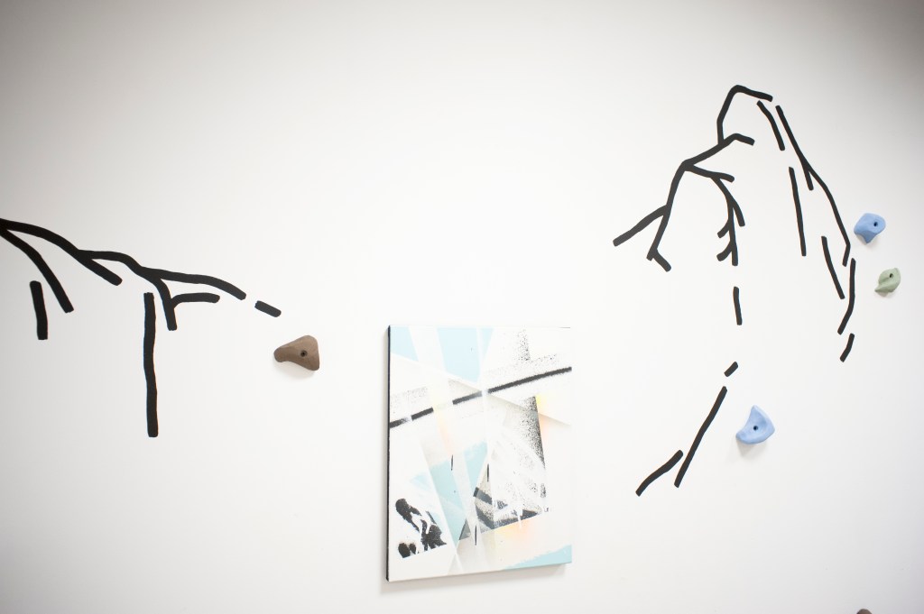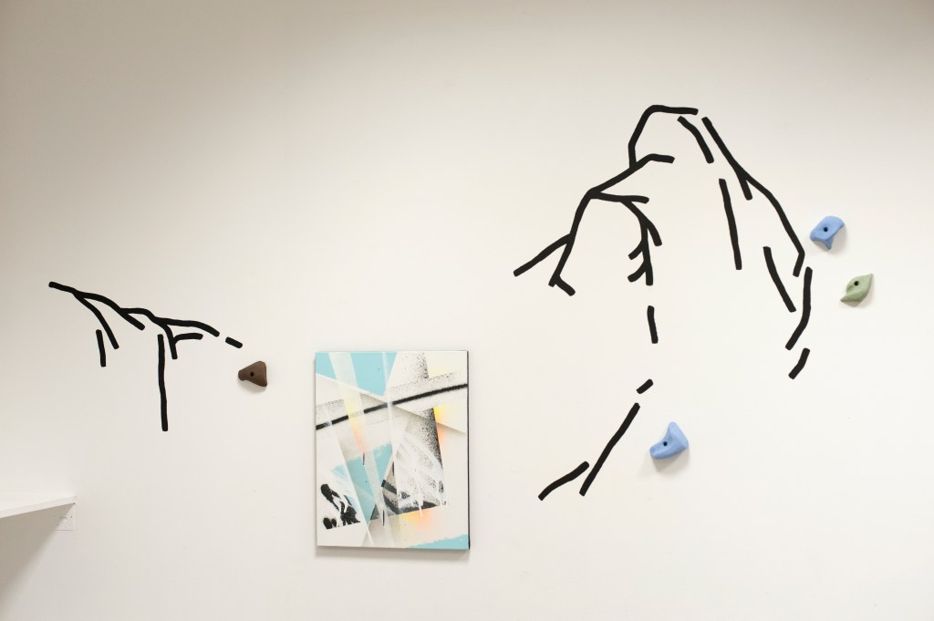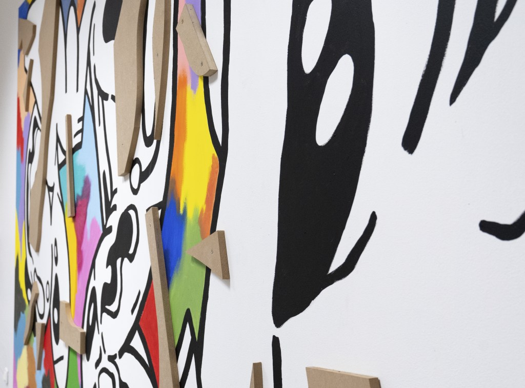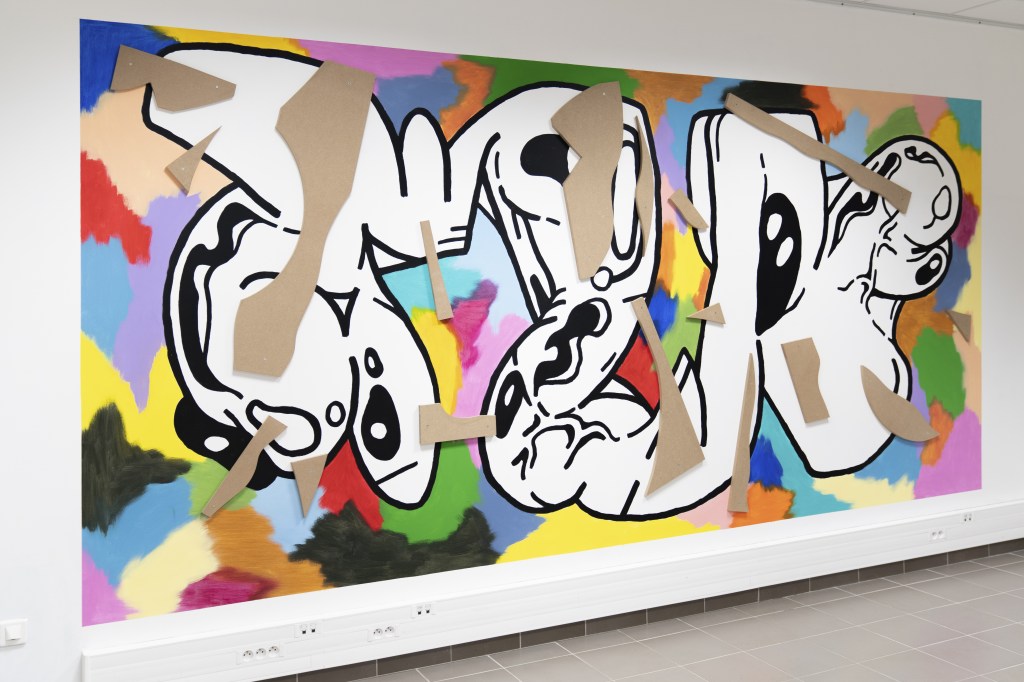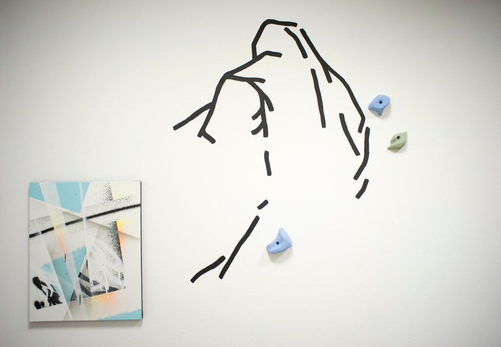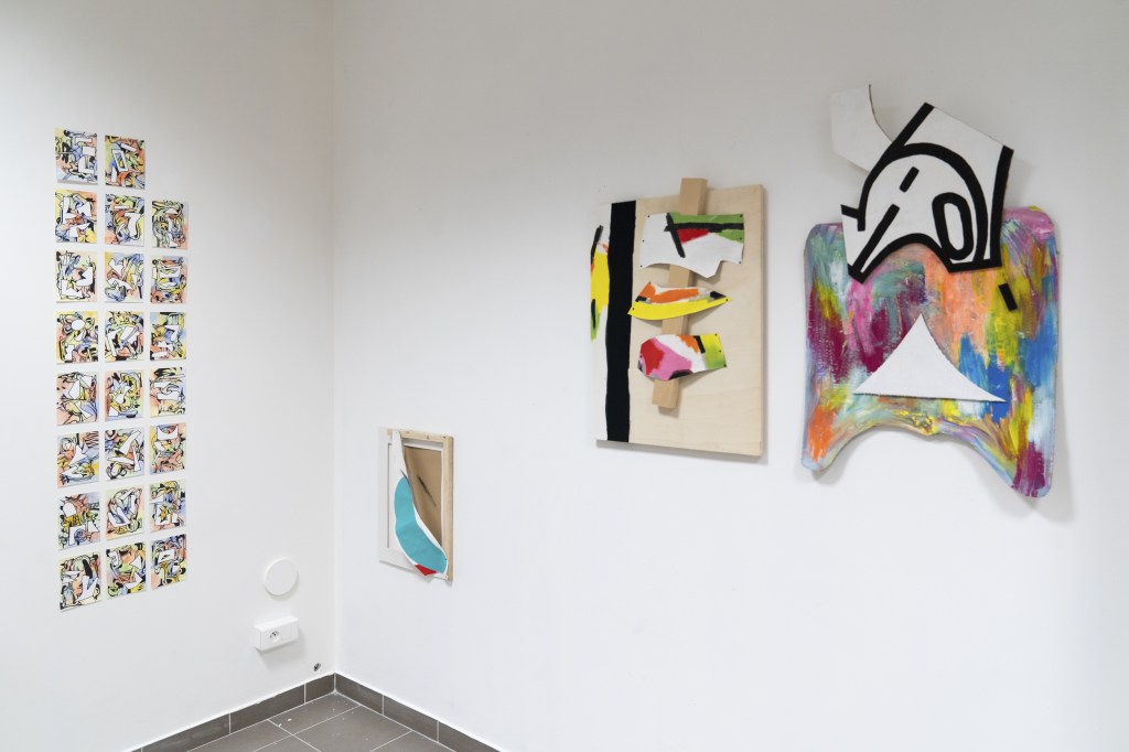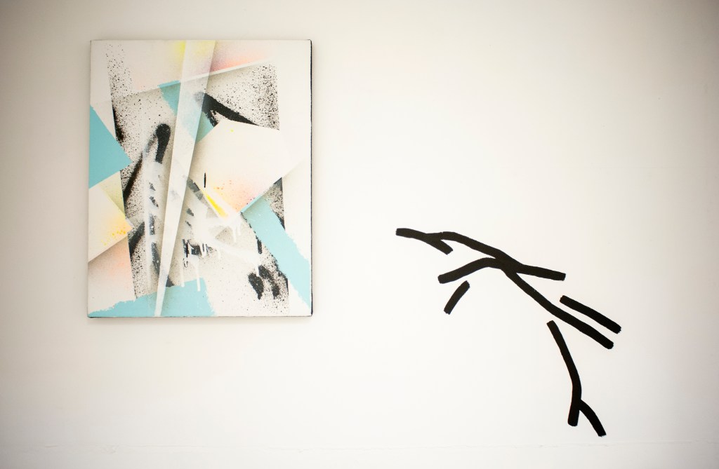 Les peintures d’Alain Bouaziz sont des générateurs de formes et d’espaces. C’est par des gestes simples qu’elles nous interpellent, une tâche, un trait, une découpe sont autant d’éléments de composition. La peinture devient alors dynamique et mouvante. Tout naturellement on comprendra le lien au corps en mouvement, au corps dansant, qu’il explore et tente de réinterpréter par l’action du peintre. Comme une poursuite du geste, non sans ironie et références assumées. Le mur devient une piste, terrain de composition, de chorégraphie et de relâchement. Ici s’accumulent, se superposent et se répondent les feuilles, les marques, en temps-lié.
