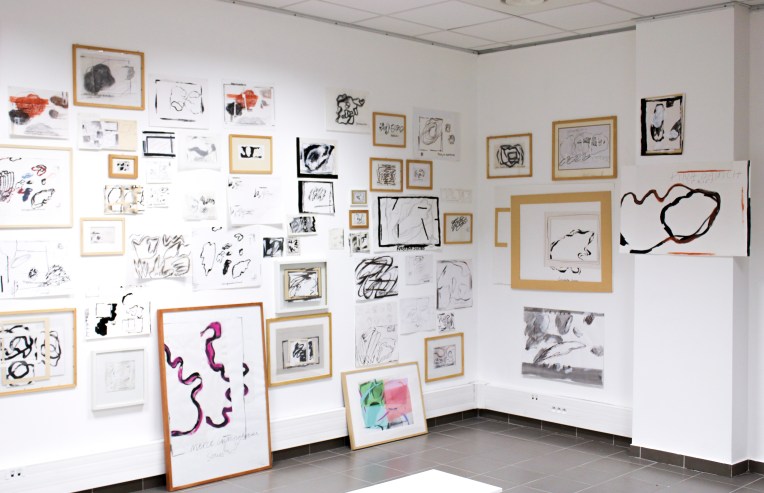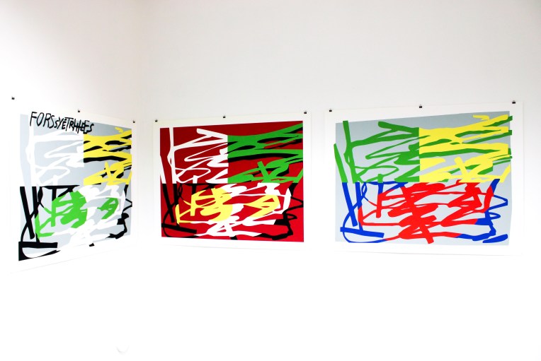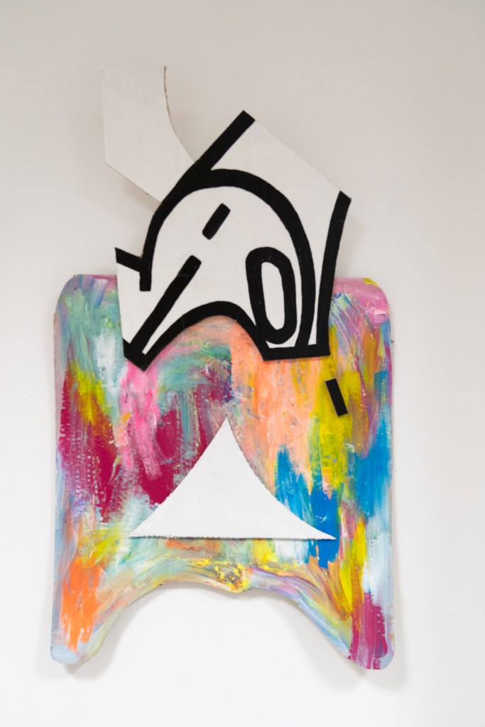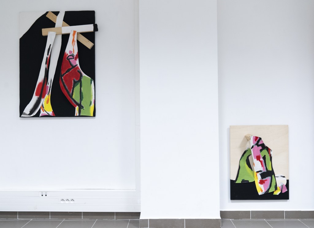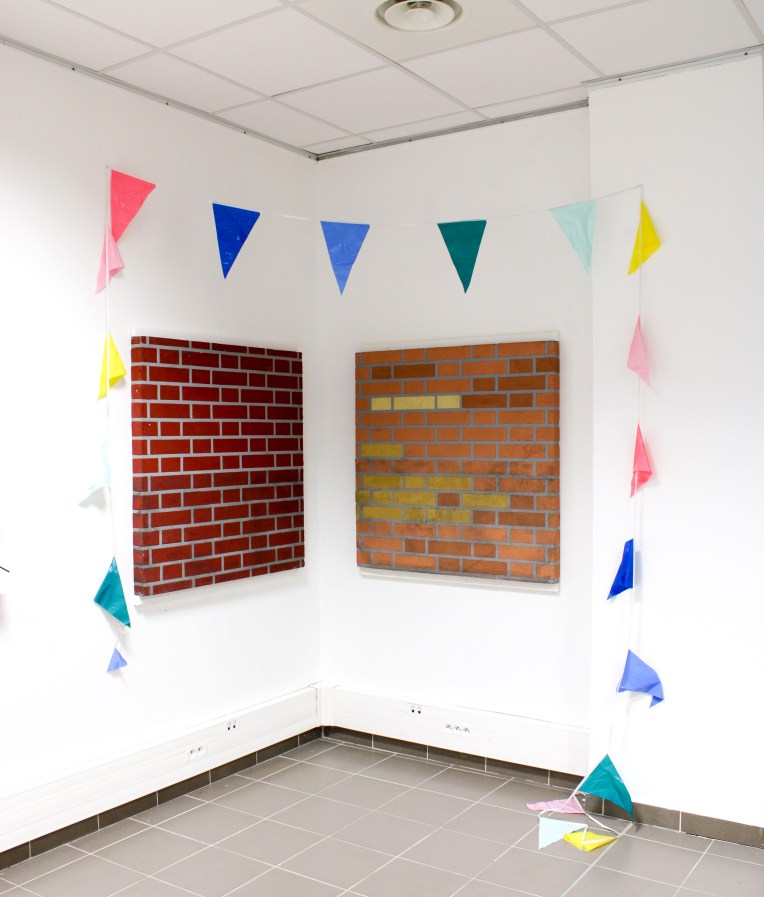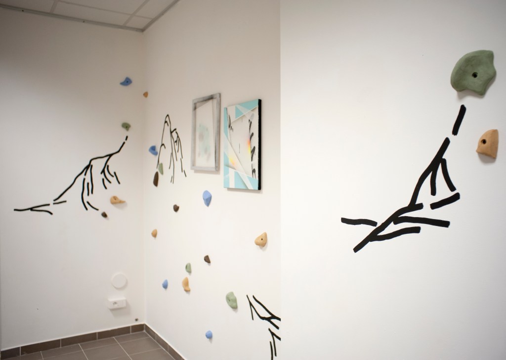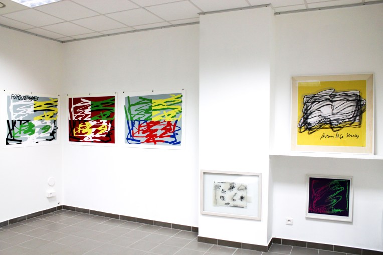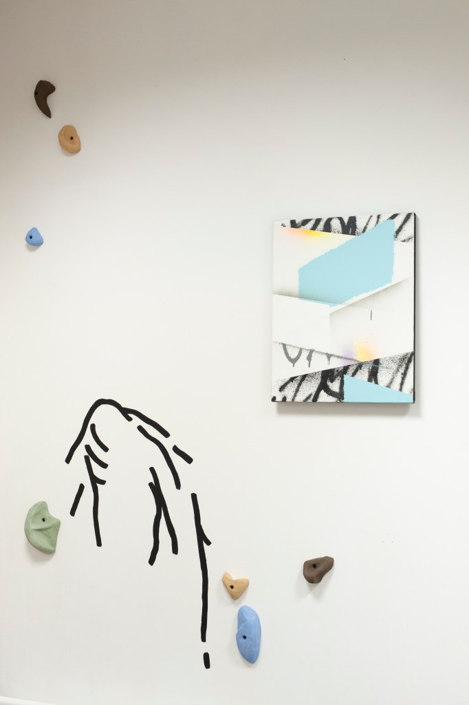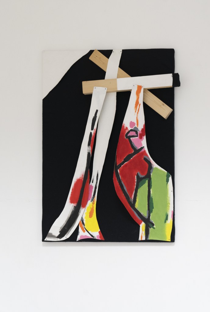 Les peintures d’Alain Bouaziz sont des générateurs de formes et d’espaces. C’est par des gestes simples qu’elles nous interpellent, une tâche, un trait, une découpe sont autant d’éléments de composition. La peinture devient alors dynamique et mouvante. Tout naturellement on comprendra le lien au corps en mouvement, au corps dansant, qu’il explore et tente de réinterpréter par l’action du peintre. Comme une poursuite du geste, non sans ironie et références assumées. Le mur devient une piste, terrain de composition, de chorégraphie et de relâchement. Ici s’accumulent, se superposent et se répondent les feuilles, les marques, en temps-lié.