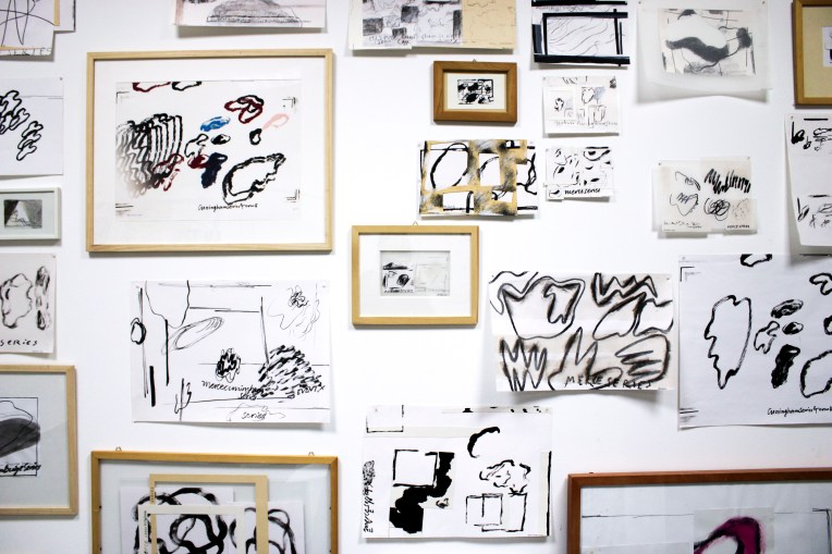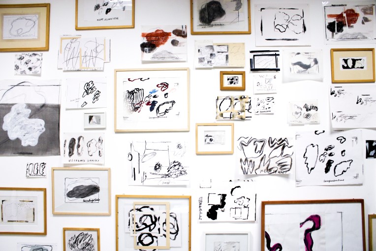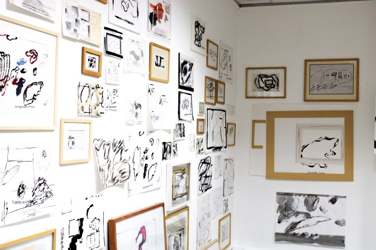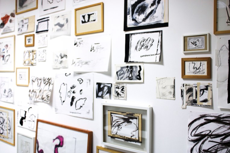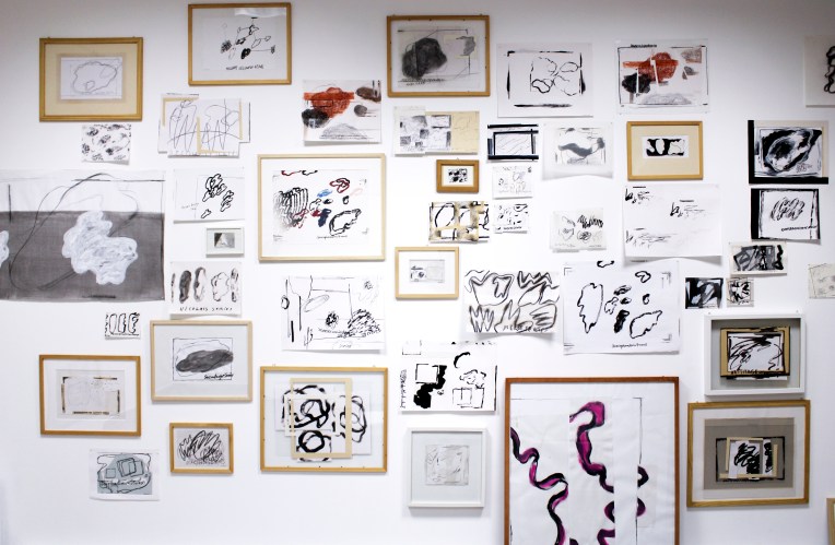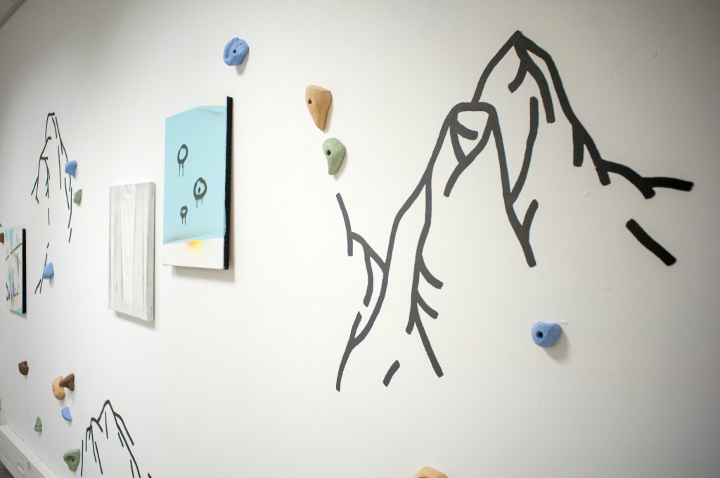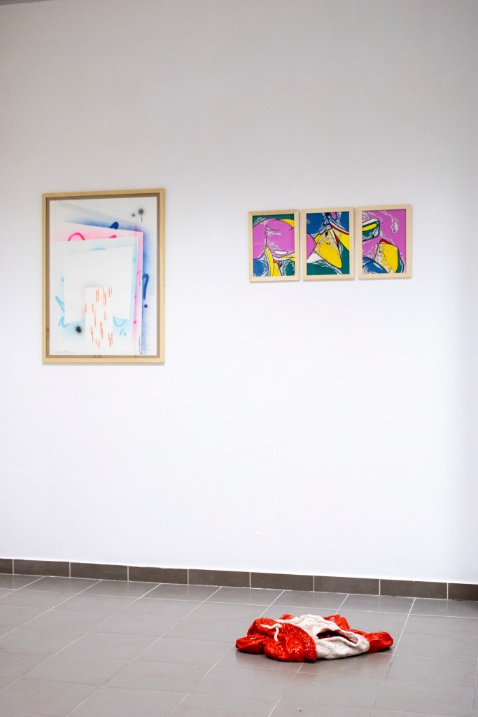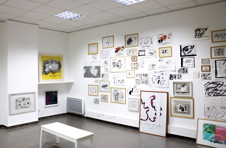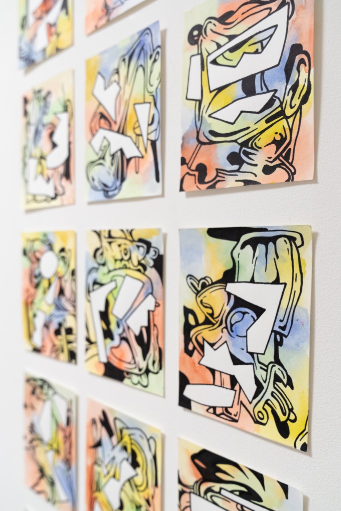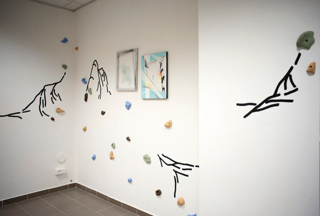 Les peintures d’Alain Bouaziz sont des générateurs de formes et d’espaces. C’est par des gestes simples qu’elles nous interpellent, une tâche, un trait, une découpe sont autant d’éléments de composition. La peinture devient alors dynamique et mouvante. Tout naturellement on comprendra le lien au corps en mouvement, au corps dansant, qu’il explore et tente de réinterpréter par l’action du peintre. Comme une poursuite du geste, non sans ironie et références assumées. Le mur devient une piste, terrain de composition, de chorégraphie et de relâchement. Ici s’accumulent, se superposent et se répondent les feuilles, les marques, en temps-lié.