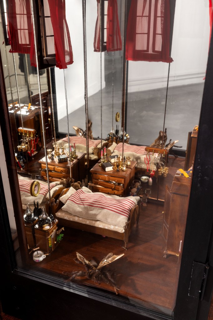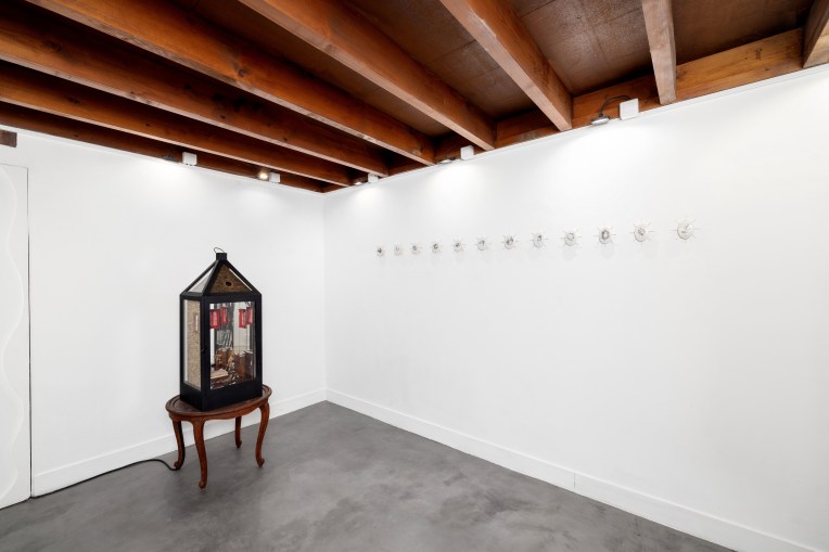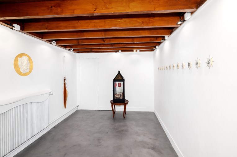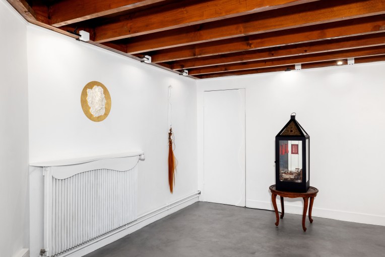 Danaé Monseigny dramatise ses œuvres comme des miroirs partiels de la société, des cheminements oniriques et une réflexion personnelle sur l’art et ses épreuves plastiques. Chacune est un tissage particulier dans lequel son intitulé, sa fabrication et son univers esthétique agissent de concert. Face aux œuvres, on ne peut que se surprendre à interroger chaque éclat allusif, et toutes choses étant par ailleurs égales, on se surprend à accompagner fictivement l’artiste imaginant la confection d’objets habités plutôt que composant des œuvres délimitées. Partant, les parcours ou les dérives rêveuses d’où l’artiste embarque le spectateur dans ses voyages oniriques foisonnent. Bien que démesurément agrandi, un médaillon au contenu délicat conserve le souffle et les mystères d’un objet intime. Partant encore, un assemblage en forme de sceptre articulant une longue et fine branche emmaillotée de sparadrap, d’orfèvrerie et coiffée de longs cheveux roux rétroprojette des fictions maliques supposées ancestrales sur une autorité féminine. Partant toujours, une vitrine architecturée comme une église est posée sur un guéridon dont les pieds graciles et galbés silhouettent une personnalité féminine. Ses parois de verre déploient des fenêtres et suggèrent en même temps des théâtres intérieurs dans une ambiance de grenier rempli de son capharnaüm. On se passionne pour les possibilités de résonnances et la somptuosité esthétique de matériaux retenus pour leur coloris autant que pour leurs matières réelles ou fantasmées, le soin accordé à une mise en vue à fois fureteuse de possibilité expressive et peut-être fantastique. Danaé Monseigny chemine à travers son imagination auctoriale, elle file des agencements créateurs de paraboles à travers lesquelles le sens de son art se creuse des apparences de l’œuvre, ou consacre l’illogisme ouvrant pour l’imagination d’un décollage provocateur : chaque cheminement intrique d’inexplicables préférences esthétiques. Avec son spectacle, chaque œuvre mobilise des perspectives multiples et entremêle les horizons pour porter des présences phénoménologiques autant que des détachements souvent magiques, et toujours une aura d’émerveillement.