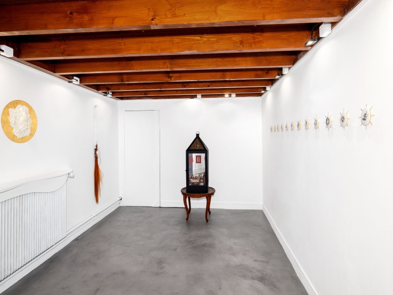 Danaé Monseigny dramatise ses œuvres comme des miroirs partiels de la société, des cheminements oniriques et une réflexion personnelle sur l’art et ses épreuves plastiques. Chacune est un tissage particulier dans lequel son intitulé, sa fabrication et son univers esthétique agissent de concert. Face aux œuvres, on ne peut que se surprendre à interroger chaque éclat allusif, et toutes choses étant par ailleurs égales, on se surprend à accompagner fictivement l’artiste imaginant la confection d’objets habités plutôt que composant des œuvres délimitées. Partant, les parcours ou les dérives rêveuses d’où l’artiste embarque le spectateur dans ses voyages oniriques foisonnent. Bien que démesurément agrandi, un médaillon au contenu délicat conserve le souffle et les mystères d’un objet intime. Partant encore, un assemblage en forme de sceptre articulant une longue et fine branche emmaillotée de sparadrap, d’orfèvrerie et coiffée de longs cheveux roux rétroprojette des fictions maliques supposées ancestrales sur une autorité féminine. Partant toujours, une vitrine architecturée comme une église est posée sur un guéridon dont les pieds graciles et galbés silhouettent une personnalité féminine. Ses parois de verre déploient des fenêtres et suggèrent en même temps des théâtres intérieurs dans une ambiance de grenier rempli de son capharnaüm. On se passionne pour les possibilités de résonnances et la somptuosité esthétique de matériaux retenus pour leur coloris autant que pour leurs matières réelles ou fantasmées, le soin accordé à une mise en vue à fois fureteuse de possibilité expressive et peut-être fantastique. Danaé Monseigny chemine à travers son imagination auctoriale, elle file des agencements créateurs de paraboles à travers lesquelles le sens de son art se creuse des apparences de l’œuvre, ou consacre l’illogisme ouvrant pour l’imagination d’un décollage provocateur : chaque cheminement intrique d’inexplicables préférences esthétiques. Avec son spectacle, chaque œuvre mobilise des perspectives multiples et entremêle les horizons pour porter des présences phénoménologiques autant que des détachements souvent magiques, et toujours une aura d’émerveillement.